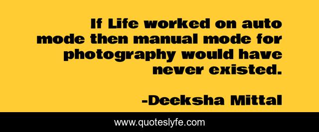 This page presents the quote "If Life worked on auto mode then manual mode for photography would have never existed.". Author of this quote is Deeksha Mittal. This quote is about life, dslr, photographer, photography, photographers, learning,.