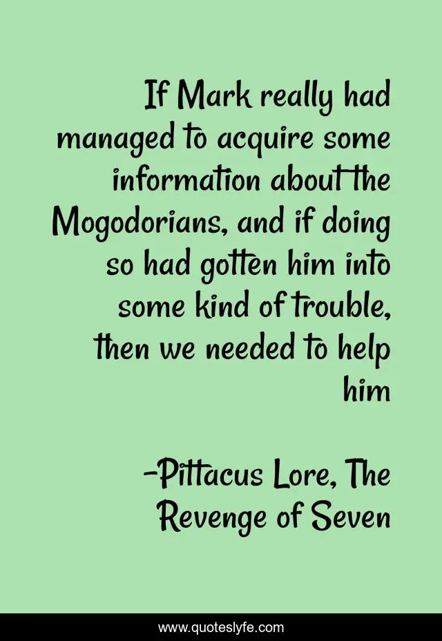 This page presents the quote "If Mark really had managed to acquire some information about the Mogodorians, and if doing so had gotten him into some kind of trouble, then we needed to help him". Author of this quote is Pittacus Lore, The Revenge of Seven. This quote is about seven, pittacus-lore, revenge,.