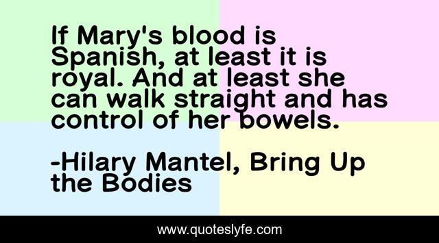 This page presents the quote "If Mary's blood is Spanish, at least it is royal. And at least she can walk straight and has control of her bowels.". Author of this quote is Hilary Mantel, Bring Up the Bodies. .