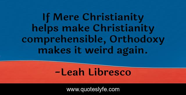 This page presents the quote "If Mere Christianity helps make Christianity comprehensible, Orthodoxy makes it weird again.". Author of this quote is Leah Libresco. This quote is about mystery, simplicity,.