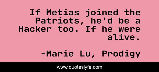 This page presents the quote "If Metias joined the Patriots, he'd be a Hacker too. If he were alive.". Author of this quote is Marie Lu, Prodigy. This quote is about hacker, metias-iparis, patriots, dead,.