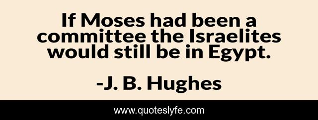 This page presents the quote "If Moses had been a committee the Israelites would still be in Egypt.". Author of this quote is J. B. Hughes. This quote is about clubs, institutions,.