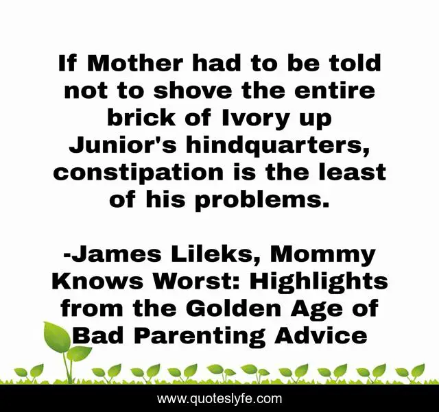 This page presents the quote "If Mother had to be told not to shove the entire brick of Ivory up Junior's hindquarters, constipation is the least of his problems.". Author of this quote is James Lileks, Mommy Knows Worst: Highlights from the Golden Age of Bad Parenting Advice. This quote is about parenting, constipation,.
