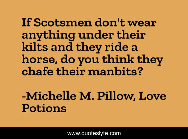 This page presents the quote "If Scotsmen don't wear anything under their kilts and they ride a horse, do you think they chafe their manbits?". Author of this quote is Michelle M. Pillow, Love Potions. This quote is about magic, shifters, highlanders, romance, witches, scottish,.