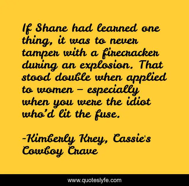 This page presents the quote "If Shane had learned one thing, it was to never tamper with a firecracker during an explosion. That stood double when applied to women – especially when you were the idiot who’d lit the fuse.". Author of this quote is Kimberly Krey, Cassie's Cowboy Crave. This quote is about humorous, humorous-relationship, what-men-know-about-women, humor-relationships-women,.