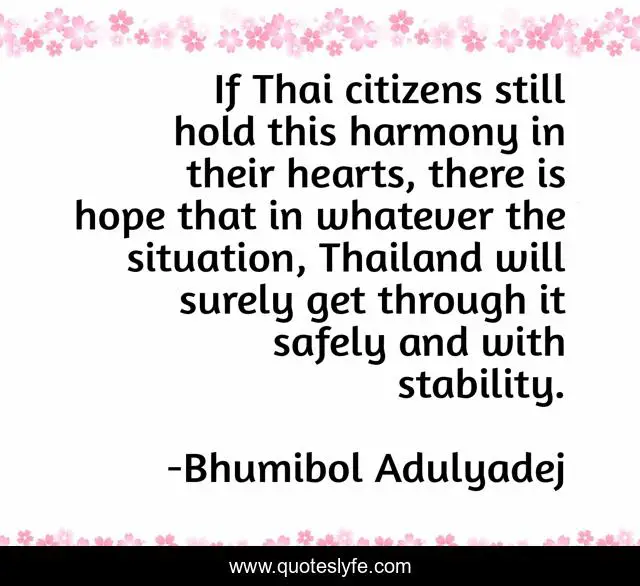 "Bhumibol Adulyadej Quotes." Quoteslyfe.com, 2025. Tue. 09 Dec. 2025. <https://www.quoteslyfe.com/quote/If-Thai-citizens-still-hold-this-harmony-282721>.