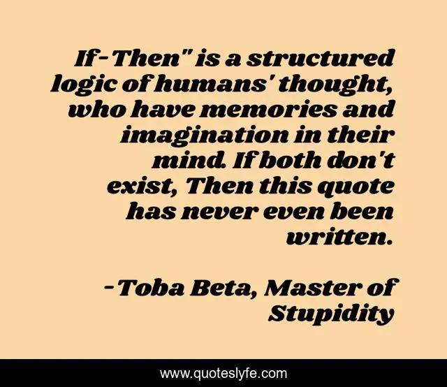This page presents the quote "If-Then" is a structured logic of humans' thought, who have memories and imagination in their mind. If both don't exist, Then this quote has never even been written.". Author of this quote is Toba Beta, Master of Stupidity. This quote is about imagination, if-then, memories,.