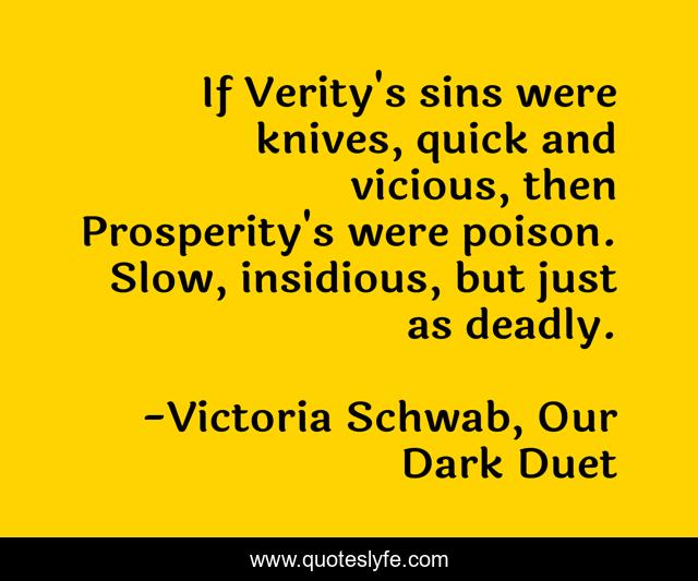This page presents the quote "If Verity's sins were knives, quick and vicious, then Prosperity's were poison. Slow, insidious, but just as deadly.". Author of this quote is Victoria Schwab, Our Dark Duet. This quote is about prosperity, sins, verity,.