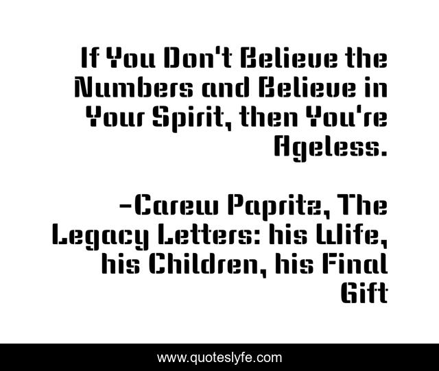 This page presents the quote "If You Don't Believe the Numbers and Believe in Your Spirit, then You're Ageless.". Author of this quote is Carew Papritz, The Legacy Letters: his Wife, his Children, his Final Gift. This quote is about aging, life, quotes, the-legacy-letters, carew-papritz, believe, spirit,.