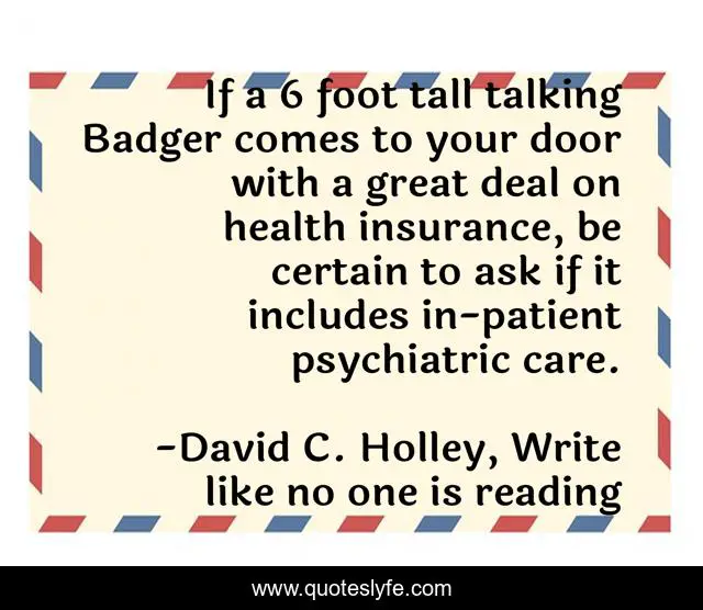 This page presents the quote "If a 6 foot tall talking Badger comes to your door with a great deal on health insurance, be certain to ask if it includes in-patient psychiatric care.". Author of this quote is David C. Holley, Write like no one is reading. This quote is about crazy, humor, health-insurance, sales, psychiatric, jokes, badger,.