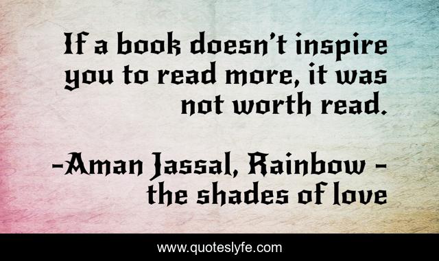 This page presents the quote "If a book doesn’t inspire you to read more, it was not worth read.". Author of this quote is Aman Jassal, Rainbow - the shades of love. This quote is about book-lover, reading-motivation, book-lovers, readers, read, reading-books, book, books, reader,.