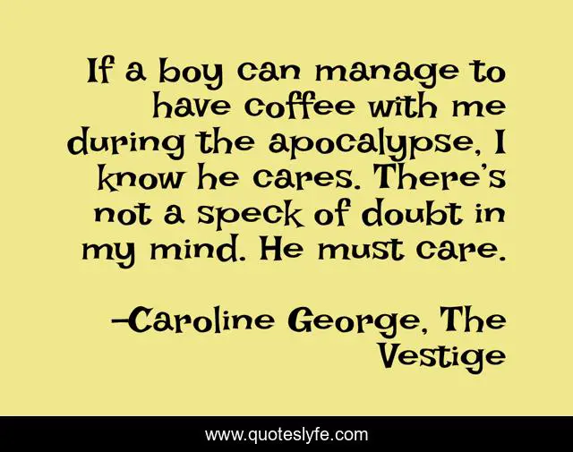 This page presents the quote "If a boy can manage to have coffee with me during the apocalypse, I know he cares. There’s not a speck of doubt in my mind. He must care.". Author of this quote is Caroline George, The Vestige. This quote is about crush, coffee, love, author, science-fiction, romance, books, end-of-the-world, apocalypse,.