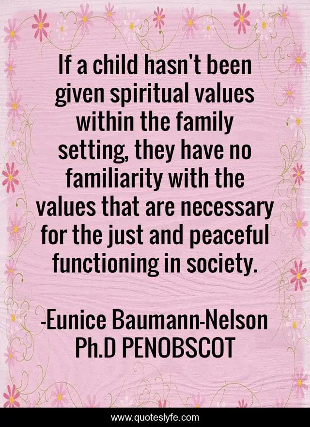 This page presents the quote "If a child hasn't been given spiritual values within the family setting, they have no familiarity with the values that are necessary for the just and peaceful functioning in society.". Author of this quote is Eunice Baumann-Nelson Ph.D PENOBSCOT. This quote is about parenting, native-american, children, spiritual-values, society,.