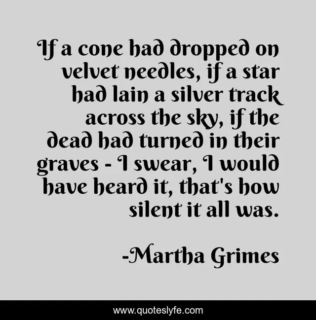 This page presents the quote "If a cone had dropped on velvet needles, if a star had lain a silver track across the sky, if the dead had turned in their graves - I swear, I would have heard it, that's how silent it all was.". Author of this quote is Martha Grimes. .