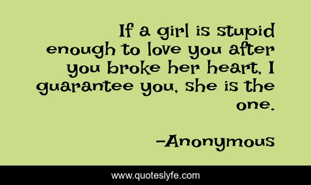 This page presents the quote "If a girl is stupid enough to love you after you broke her heart, I guarantee you, she is the one.". Author of this quote is Anonymous. This quote is about heart, girl, love, affection,.