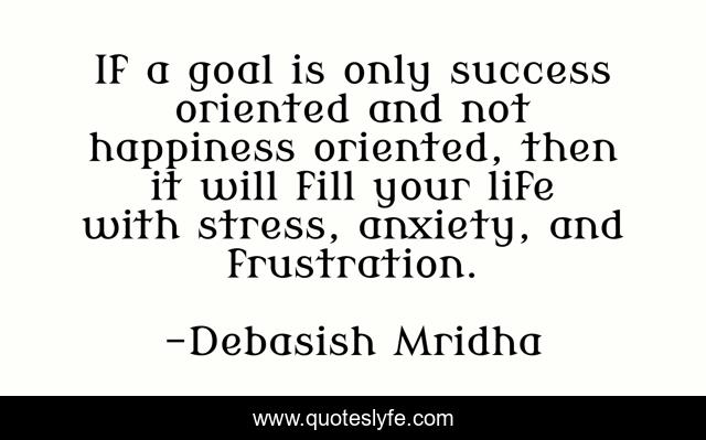 This page presents the quote "If a goal is only success oriented and not happiness oriented, then it will fill your life with stress, anxiety, and frustration.". Author of this quote is Debasish Mridha. This quote is about stress, anxiety, inspirational, philosophy, debasish-mridha, happiness-oriented, quotes, success-oriented, debasish-mridha-md,.