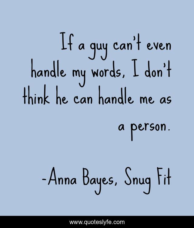 This page presents the quote "If a guy can't even handle my words, I don't think he can handle me as a person.". Author of this quote is Anna Bayes, Snug Fit. This quote is about love, relationship, banter, female, affection, self-esteem,.