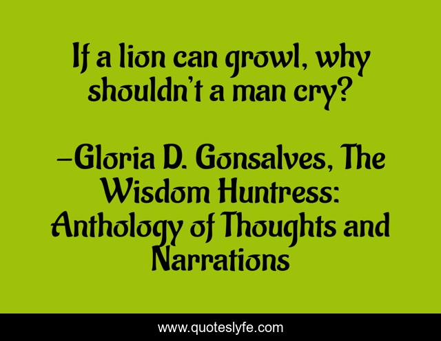This page presents the quote "If a lion can growl, why shouldn’t a man cry?". Author of this quote is Gloria D. Gonsalves, The Wisdom Huntress: Anthology of Thoughts and Narrations. This quote is about quote, quotes,.