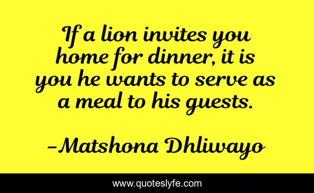 "Matshona Dhliwayo Quotes." Quoteslyfe.com, 2025. Tue. 09 Dec. 2025. <https://www.quoteslyfe.com/quote/If-a-lion-invites-you-home-for-58120>.