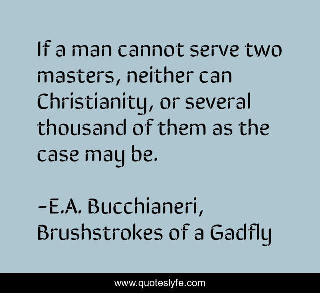 This page presents the quote "If a man cannot serve two masters, neither can Christianity, or several thousand of them as the case may be.". Author of this quote is E.A. Bucchianeri, Brushstrokes of a Gadfly. This quote is about catholic, christian, christ, god, one-christ-one-church, christianity, religion, unity, thought-provoking,.
