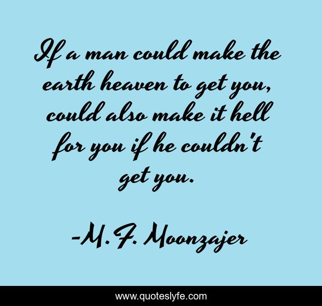 This page presents the quote "If a man could make the earth heaven to get you, could also make it hell for you if he couldn't get you.". Author of this quote is M.F. Moonzajer. This quote is about hell, heaven, love, vengeance, affection,.