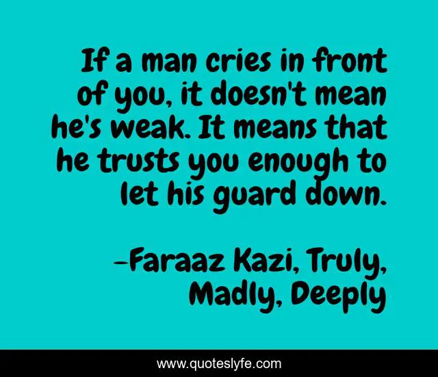 This page presents the quote "If a man cries in front of you, it doesn't mean he's weak. It means that he trusts you enough to let his guard down.". Author of this quote is Faraaz Kazi, Truly, Madly, Deeply. This quote is about true-love, love, men, sad, tragic, sad-love, trust, affection,.