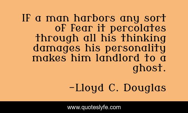 This page presents the quote "If a man harbors any sort of fear it percolates through all his thinking damages his personality makes him landlord to a ghost.". Author of this quote is Lloyd C. Douglas. .