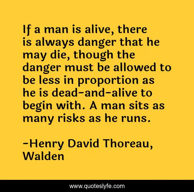 This page presents the quote "If a man is alive, there is always danger that he may die, though the danger must be allowed to be less in proportion as he is dead-and-alive to begin with. A man sits as many risks as he runs.". Author of this quote is Henry David Thoreau, Walden. This quote is about safety, risk,.