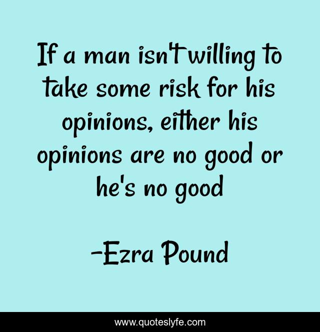 This page presents the quote "If a man isn't willing to take some risk for his opinions, either his opinions are no good or he's no good". Author of this quote is Ezra Pound. This quote is about criticism, taboos, controversy, thought, courage, intellectuals, opinion, writing,.