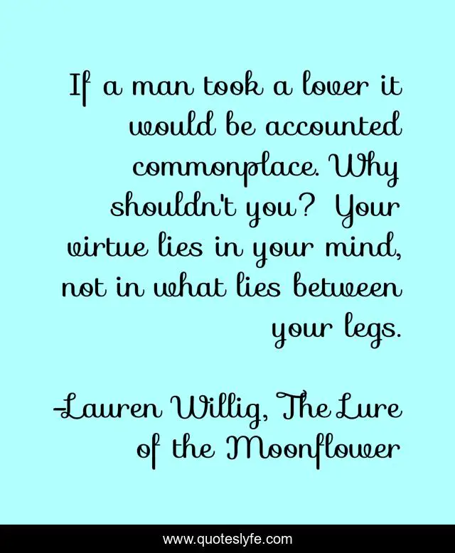 This page presents the quote "If a man took a lover it would be accounted commonplace. Why shouldn't you? Your virtue lies in your mind, not in what lies between your legs.". Author of this quote is Lauren Willig, The Lure of the Moonflower. This quote is about virtue, feminism,.