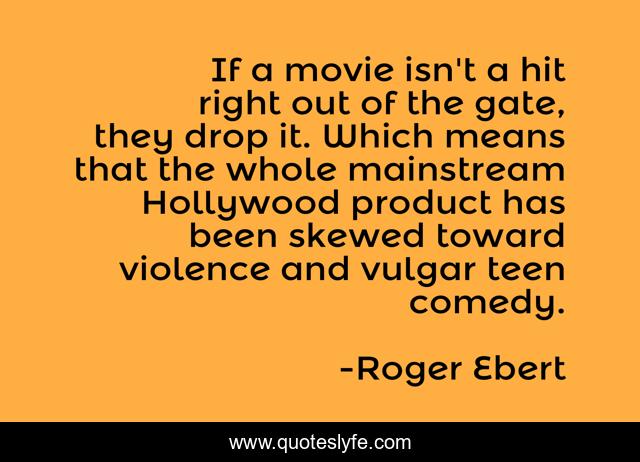 This page presents the quote "If a movie isn't a hit right out of the gate, they drop it. Which means that the whole mainstream Hollywood product has been skewed toward violence and vulgar teen comedy.". Author of this quote is Roger Ebert. This quote is about hollywood, violence, comedy,.