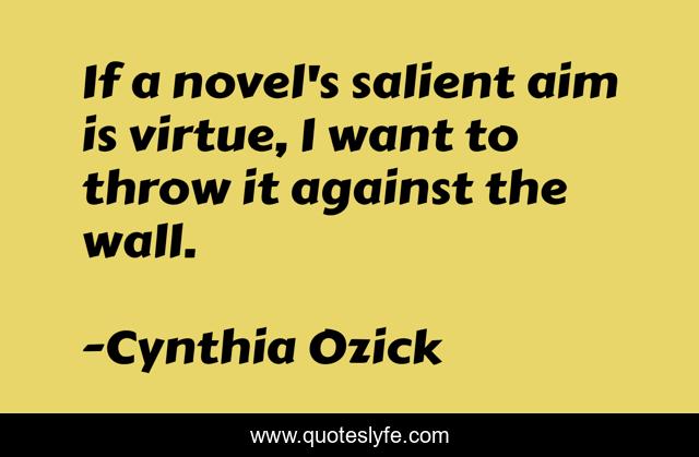 This page presents the quote "If a novel's salient aim is virtue, I want to throw it against the wall.". Author of this quote is Cynthia Ozick. This quote is about literature, art, the-novel, writing,.
