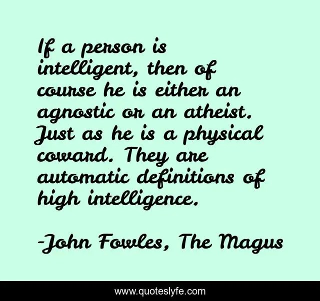This page presents the quote "If a person is intelligent, then of course he is either an agnostic or an atheist. Just as he is a physical coward. They are automatic definitions of high intelligence.". Author of this quote is John Fowles, The Magus. This quote is about atheist, coward, agnostic, intelligence,.