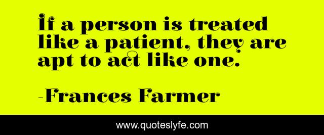This page presents the quote "If a person is treated like a patient, they are apt to act like one.". Author of this quote is Frances Farmer. This quote is about person, patient, like,.