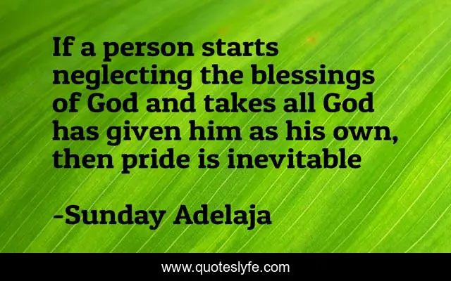 This page presents the quote "If a person starts neglecting the blessings of God and takes all God has given him as his own, then pride is inevitable". Author of this quote is Sunday Adelaja. This quote is about person, blessings, neglecting, pride, inevitble,.