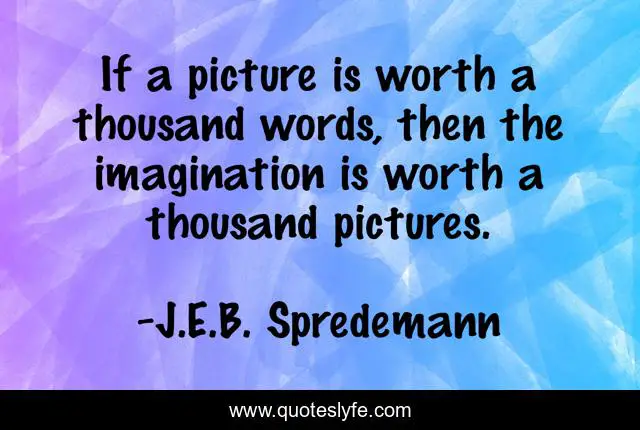 This page presents the quote "If a picture is worth a thousand words, then the imagination is worth a thousand pictures.". Author of this quote is J.E.B. Spredemann. This quote is about individuality, imagination, creativity, creation, mind, brain, thoughts-on-writing, words, god,.