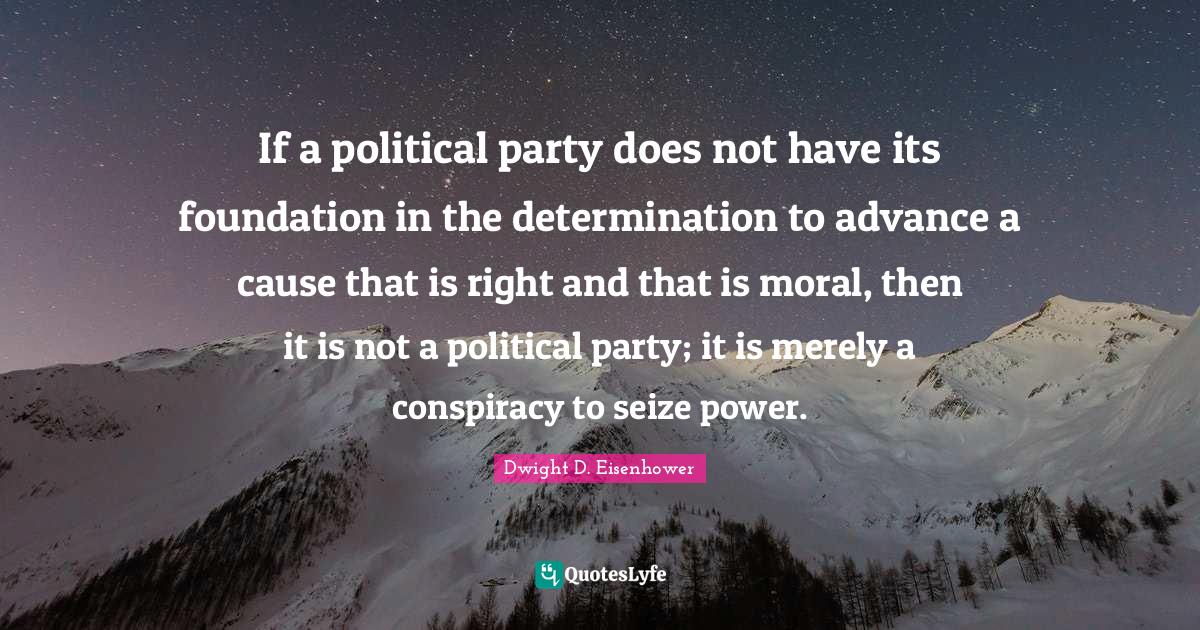 This page presents the quote "If a political party does not have its foundation in the determination to advance a cause that is right and that is moral, then it is not a political party; it is merely a conspiracy to seize power.". Author of this quote is Dwight D. Eisenhower. This quote is about party, foundation, power, moral, conspiracy, determination, political,.