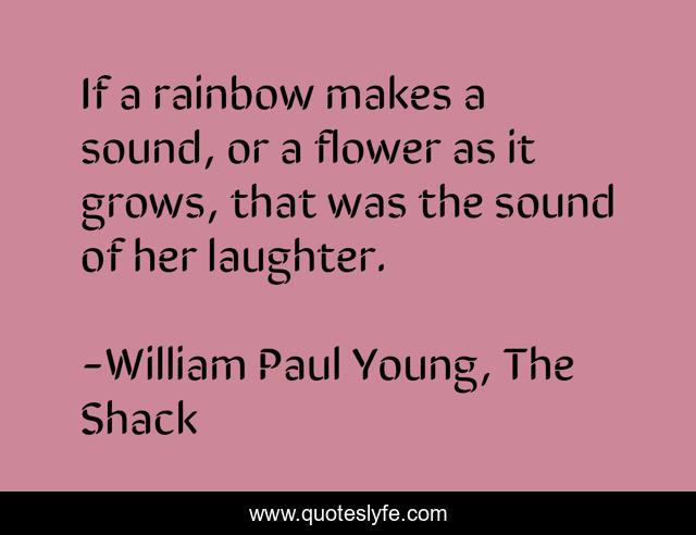 This page presents the quote "If a rainbow makes a sound, or a flower as it grows, that was the sound of her laughter.". Author of this quote is William Paul Young, The Shack. This quote is about laughter, love, beauty, affection,.