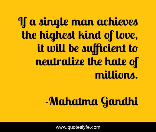 This page presents the quote "If a single man achieves the highest kind of love, it will be sufficient to neutralize the hate of millions.". Author of this quote is Mahatma Gandhi. This quote is about love, humanity, affection,.