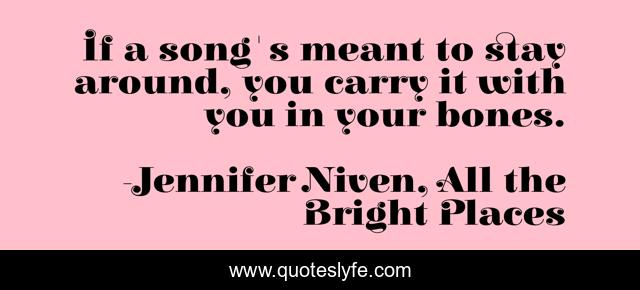 This page presents the quote "If a song's meant to stay around, you carry it with you in your bones.". Author of this quote is Jennifer Niven, All the Bright Places. This quote is about all-the-bright-places, bhie, song,.