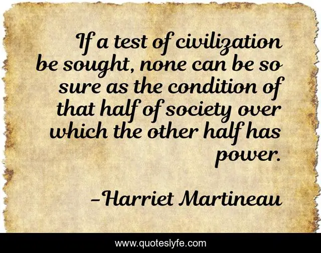 This page presents the quote "If a test of civilization be sought, none can be so sure as the condition of that half of society over which the other half has power.". Author of this quote is Harriet Martineau. This quote is about test, civilization, power,.