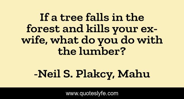 This page presents the quote "If a tree falls in the forest and kills your ex-wife, what do you do with the lumber?". Author of this quote is Neil S. Plakcy, Mahu. This quote is about divorce, humor,.