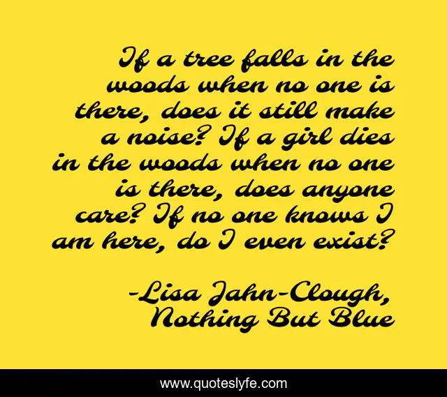 This page presents the quote "If a tree falls in the woods when no one is there, does it still make a noise? If a girl dies in the woods when no one is there, does anyone care? If no one knows I am here, do I even exist?". Author of this quote is Lisa Jahn-Clough, Nothing But Blue. This quote is about girl, woods, tree, forest,.