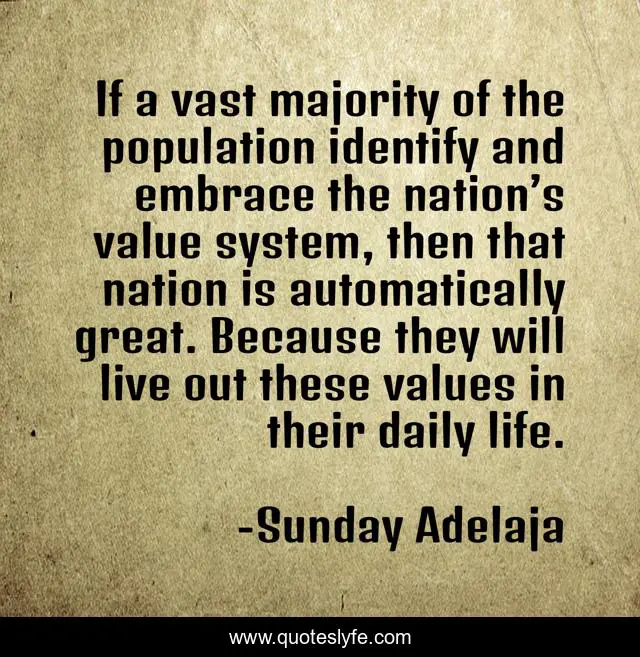 This page presents the quote "If a vast majority of the population identify and embrace the nation’s value system, then that nation is automatically great. Because they will live out these values in their daily life.". Author of this quote is Sunday Adelaja. This quote is about life, populations, system, daily, majority, live, identify, automatically, vast,.