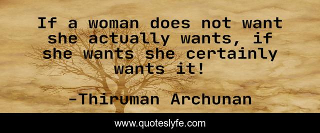 This page presents the quote "If a woman does not want she actually wants, if she wants she certainly wants it!". Author of this quote is Thiruman Archunan. This quote is about wants, woman, likes,.