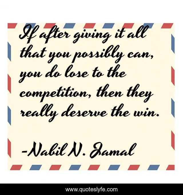 This page presents the quote "If after giving it all that you possibly can, you do lose to the competition, then they really deserve the win.". Author of this quote is Nabil N. Jamal. This quote is about all, nabil-n-jamal, give, giving, deserve, after, possible, competition, lose,.