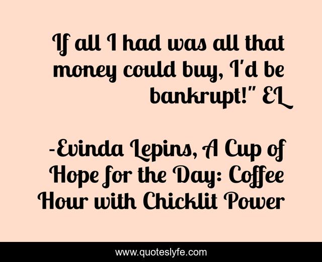 This page presents the quote "If all I had was all that money could buy, I'd be bankrupt!" EL". Author of this quote is Evinda Lepins, A Cup of Hope for the Day: Coffee Hour with Chicklit Power. This quote is about money, contentment, bankrupt,.