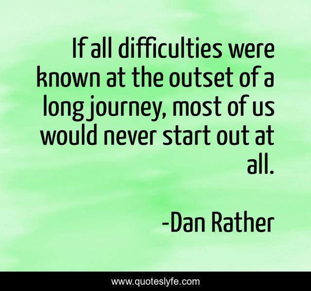 This page presents the quote "If all difficulties were known at the outset of a long journey, most of us would never start out at all.". Author of this quote is Dan Rather. This quote is about start, journey, long,.