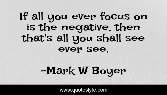 This page presents the quote "If all you ever focus on is the negative, then that's all you shall see ever see.". Author of this quote is Mark W Boyer. This quote is about confidence, positive, inspirational, positive-thoughts, enthusiasm, mark-w-boyer,.