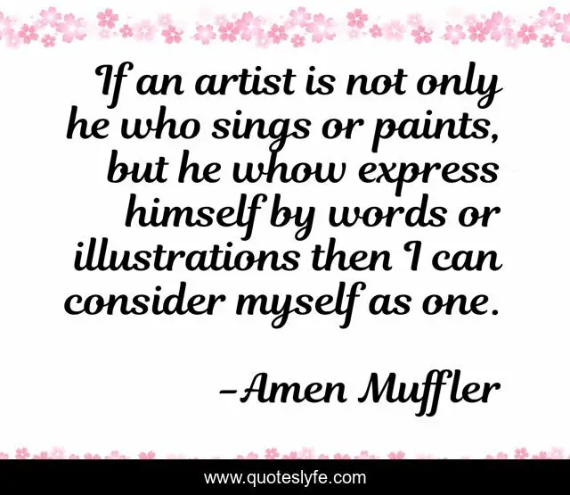 This page presents the quote "If an artist is not only he who sings or paints, but he whow express himself by words or illustrations then I can consider myself as one.". Author of this quote is Amen Muffler. This quote is about artist, art, artistic, artificial-intelligence, artistic-expression,.